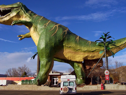 A quick visit to the informaiton centre that is the building under and in the dinosaur. If you look you will see the doors to the information centre to the left of our camper. Now I don't want to say this is big or anything but it is said to be the largest dinosaur in the world.